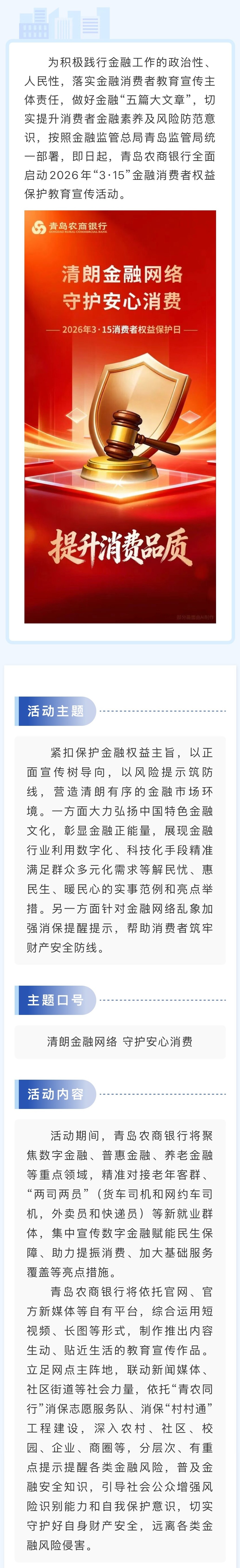 青岛农商银行全面启动2026年“315”金融消费者权益保护教育宣传工作